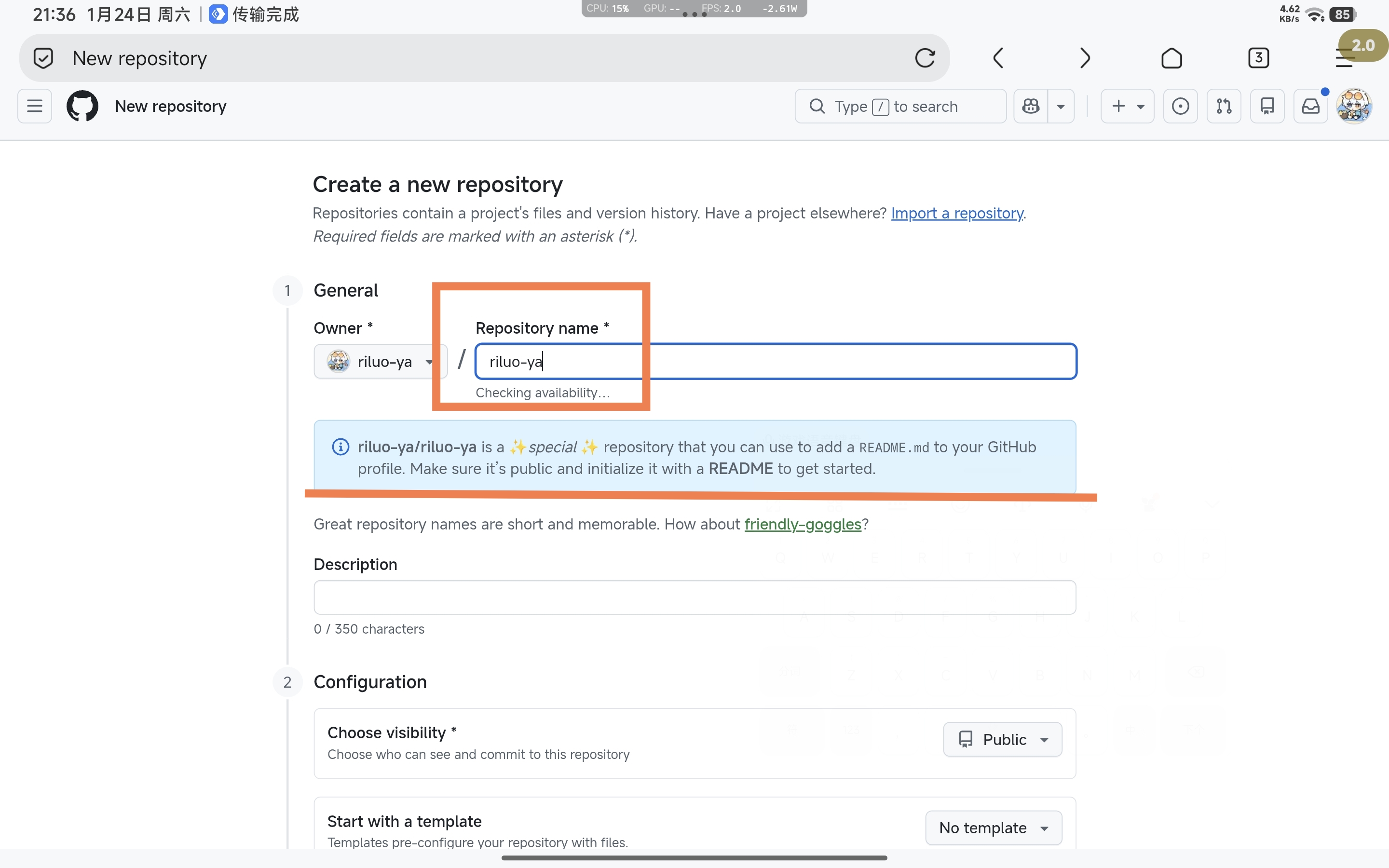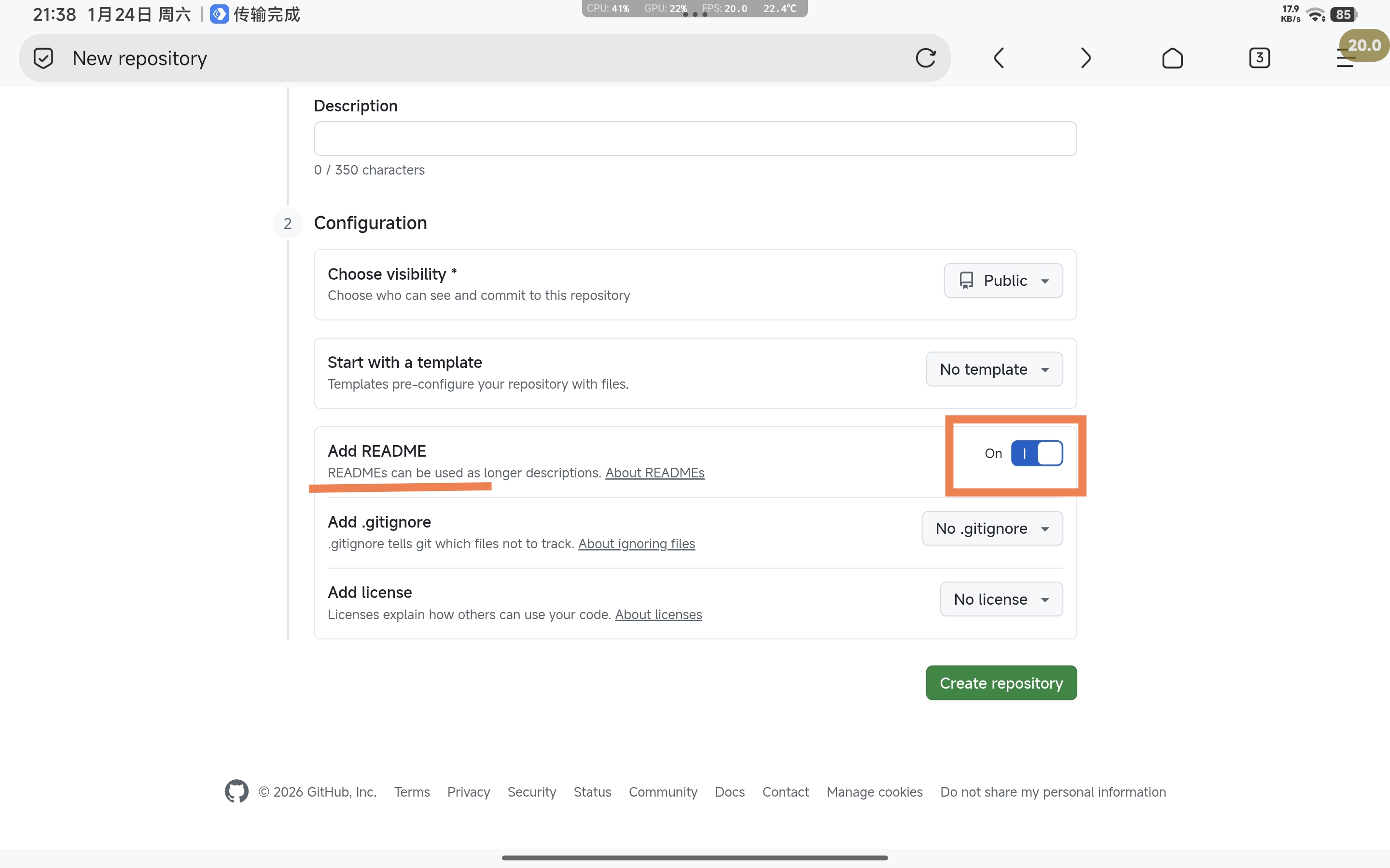 3.划到下面找到Add README后面开关点开,添加一个README
