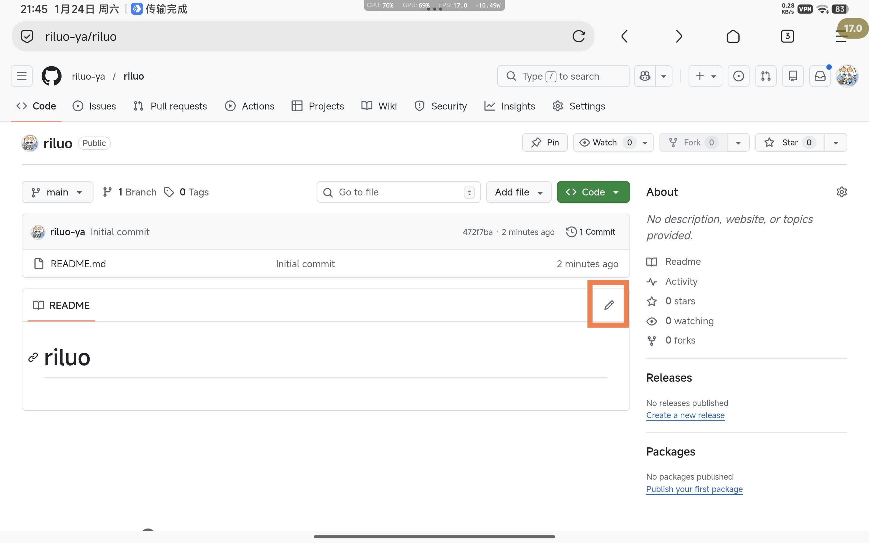 1.新建文件后就自动跳转到项目了 2.接下来就是编辑readme.md文件了 3.点击右上角的笔