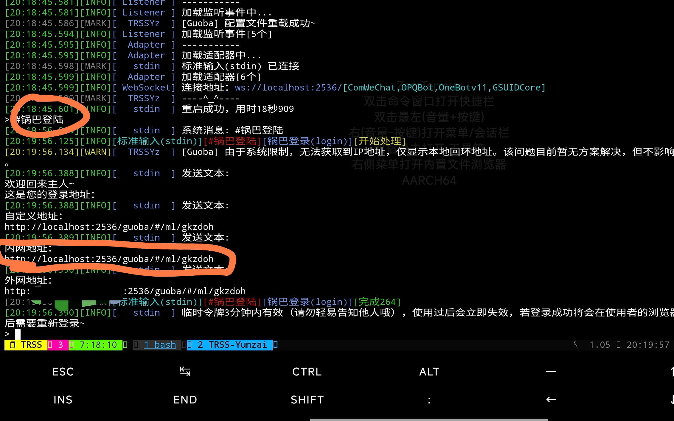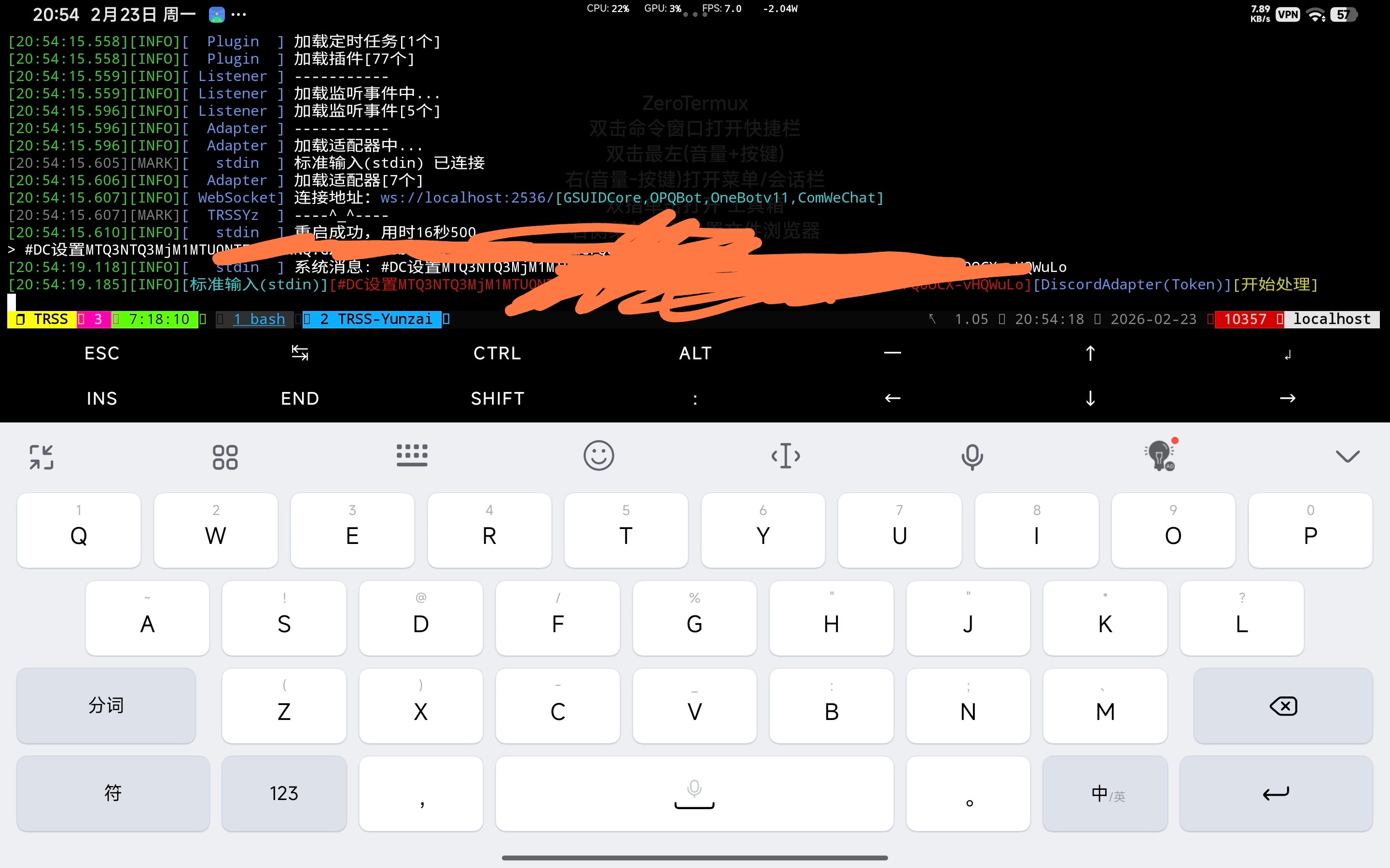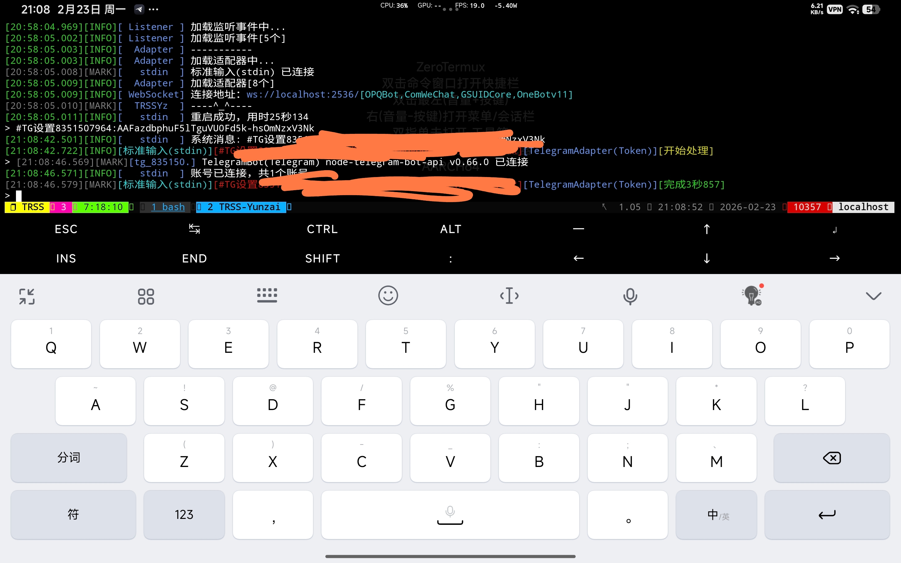 如果你已经完成了适配器的设置,对你的机器人发送 /设置主人 机器人会让你输入验证码 这时返回termux你会发现控制台打印了一串验证码 把验证码发送给机器人即可