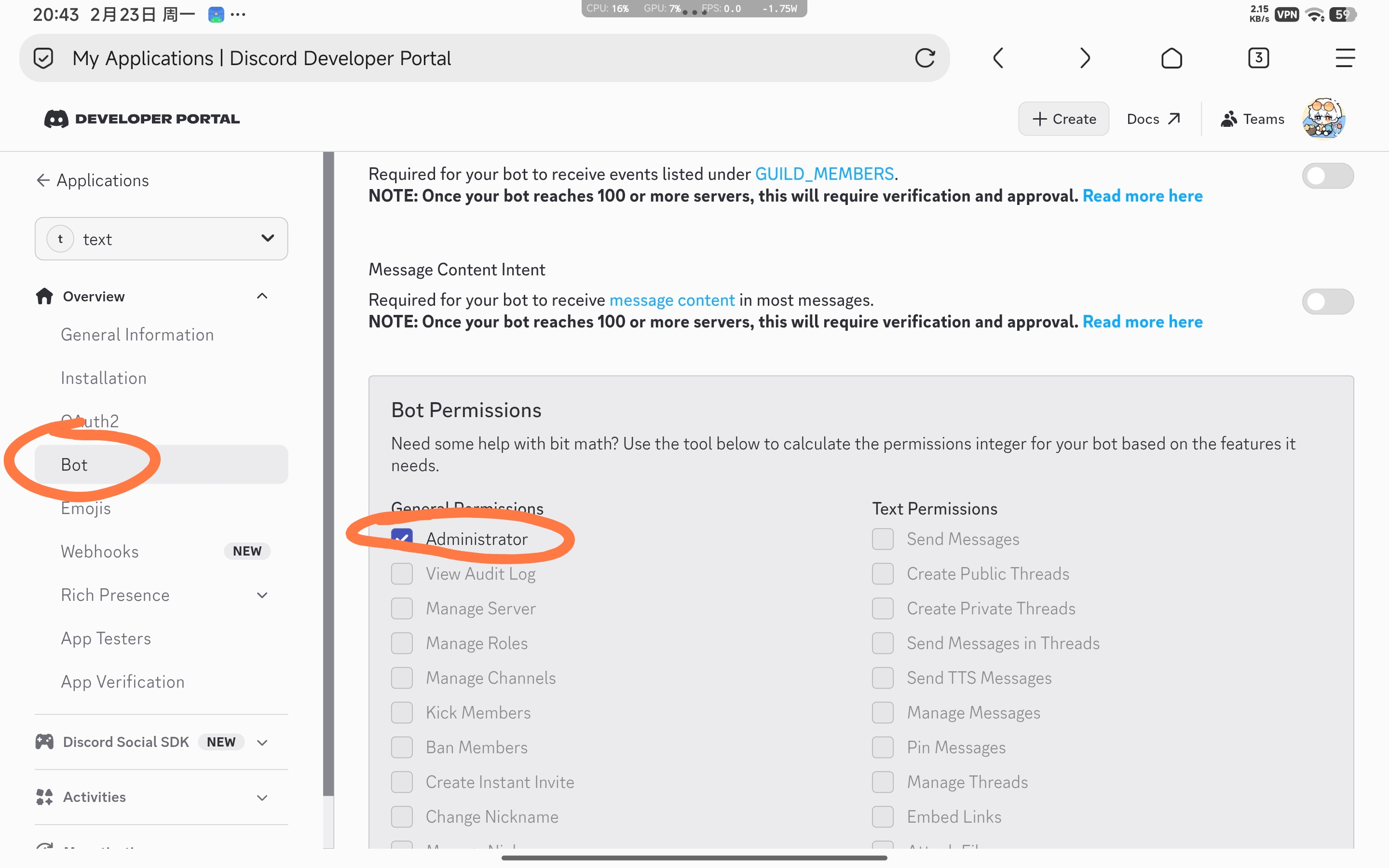 选择Bot页面下滑找到Bot Permissions选择Administrator