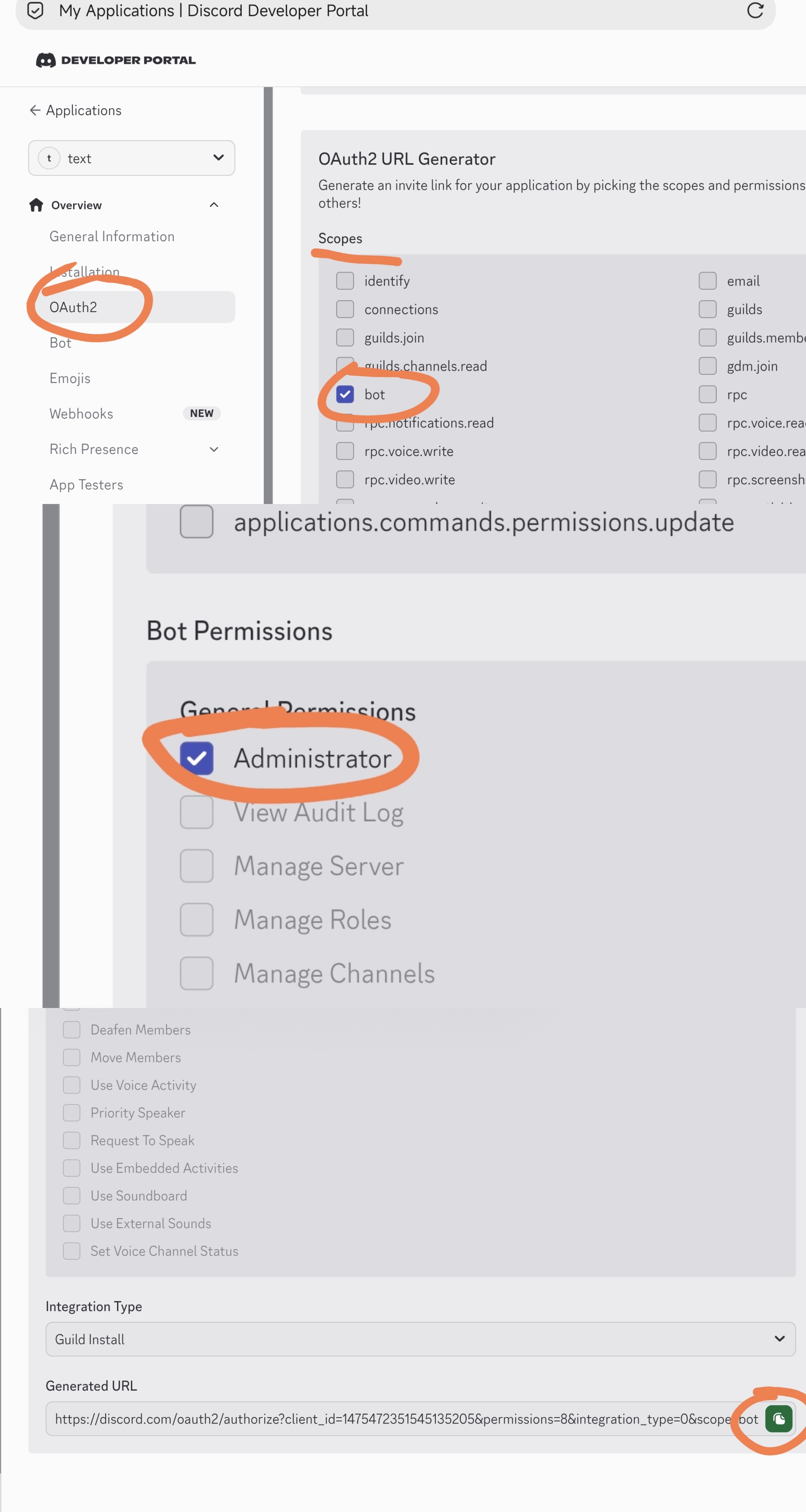 接下来就是邀请机器人进入频道 依次点击OAuth2 → URL Generator → SCOPES 选择 bot → BOT PERMISSIONS 选择 Administrator → 复制 GENERATED URL → 把机器人邀请到频道