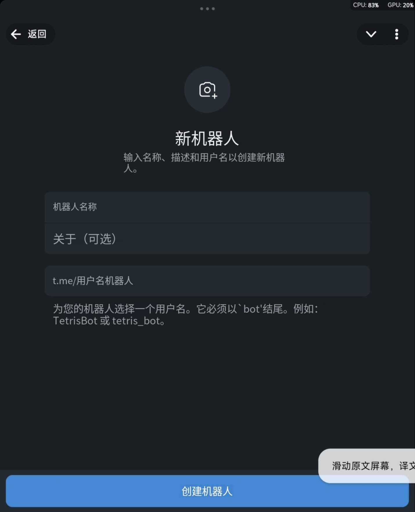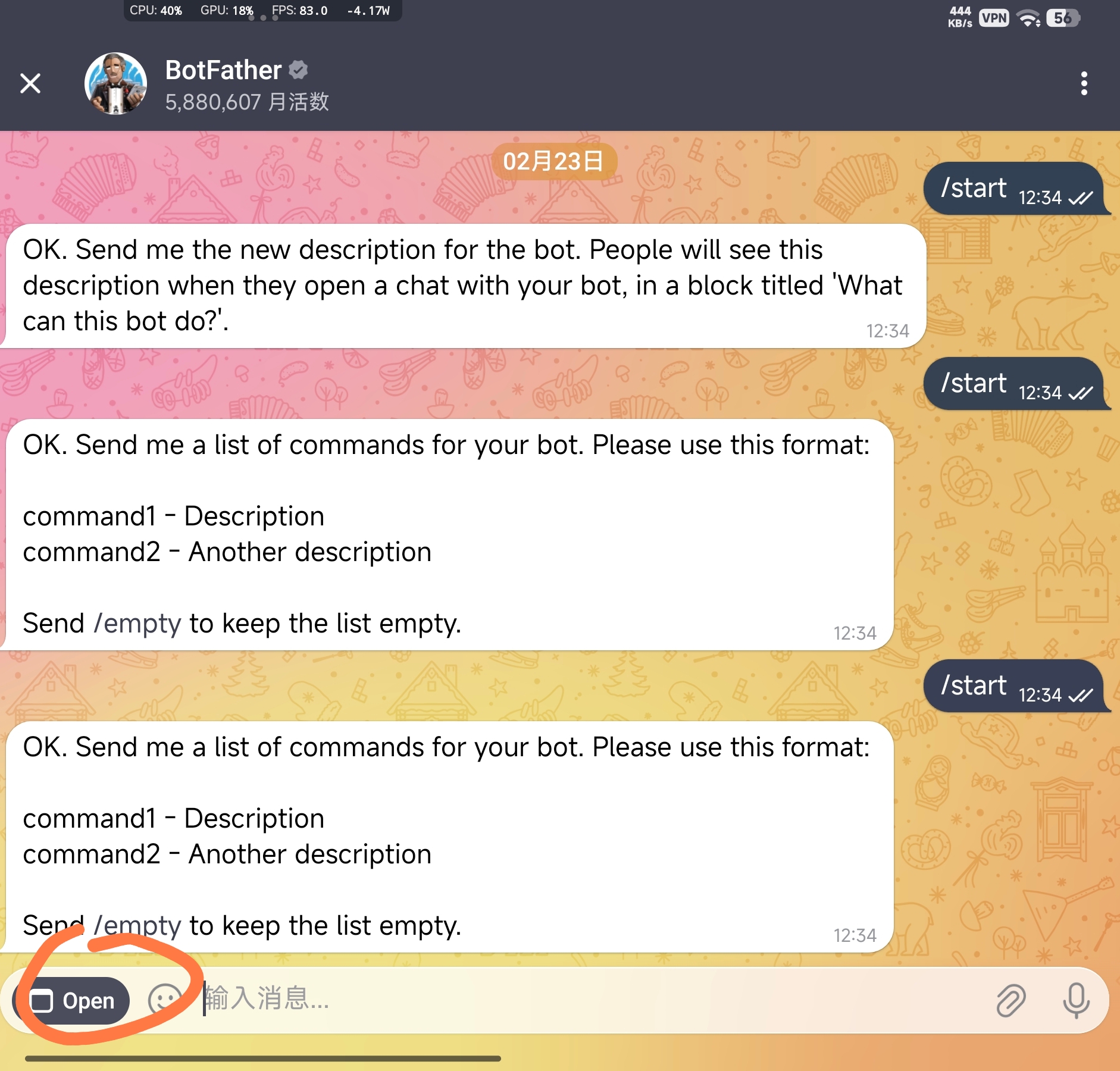 安装完成后会重启 打开下面的链接跳转到Telegram创建机器人 BotFather 点击下方的Open