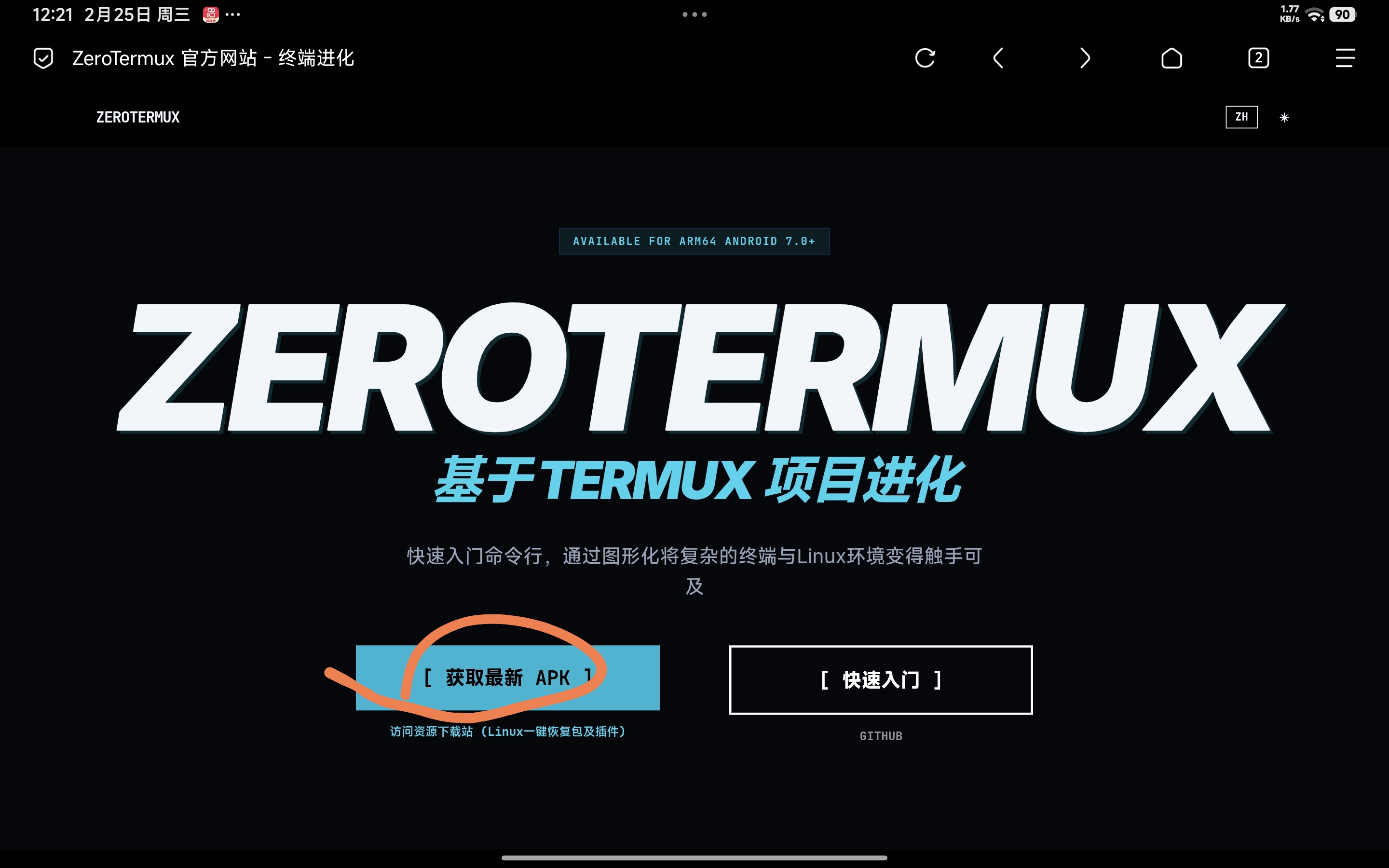 渠道一 ZeroTermux官网 打开官网后,点击中间的[ 获取最新 APK ]下载安装即可