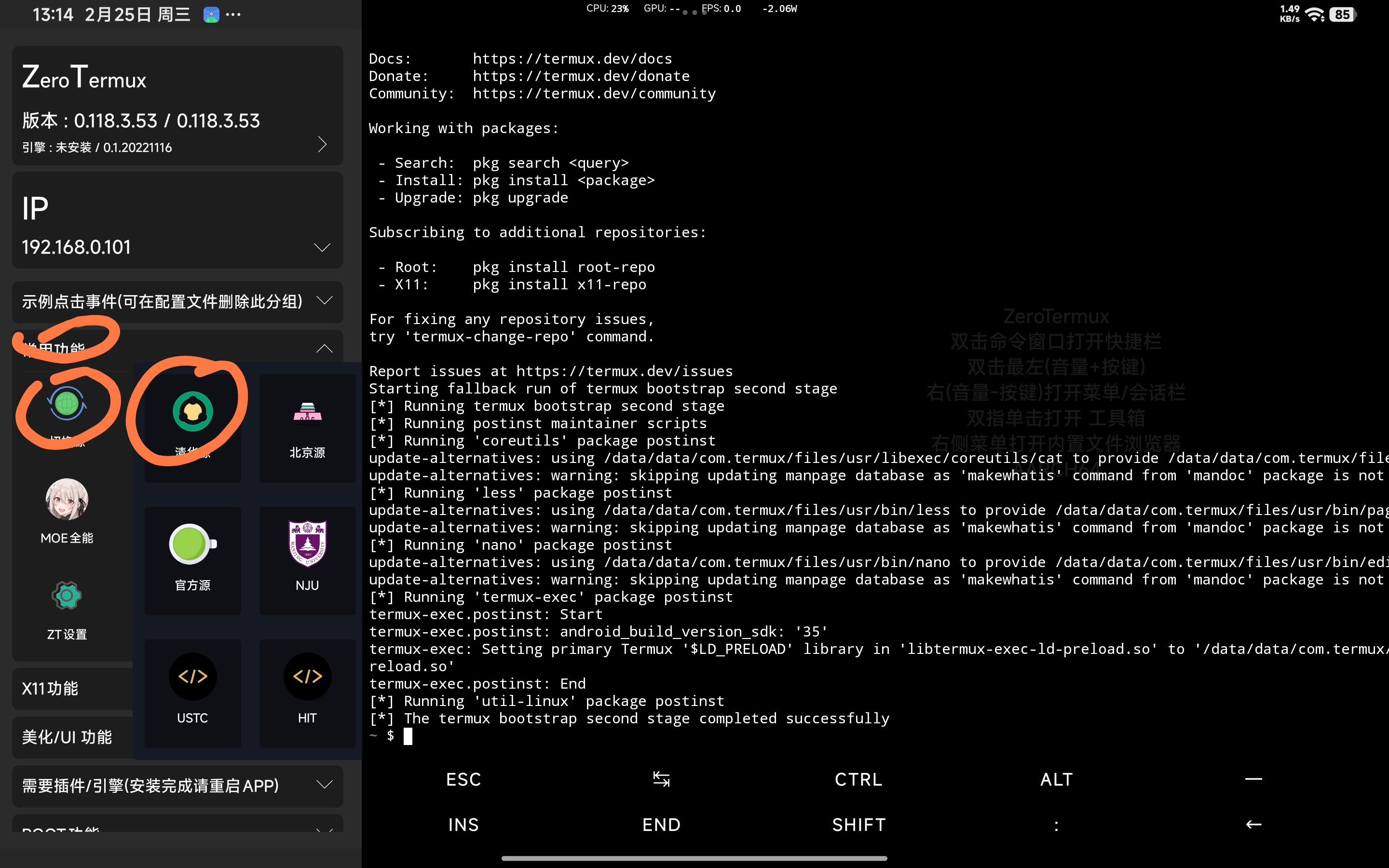 打开ZeroTermux 阅读协议给予权限 点按音量+或者双击最左侧屏幕唤出侧边栏 打开常用功能选择切换源点击清华源