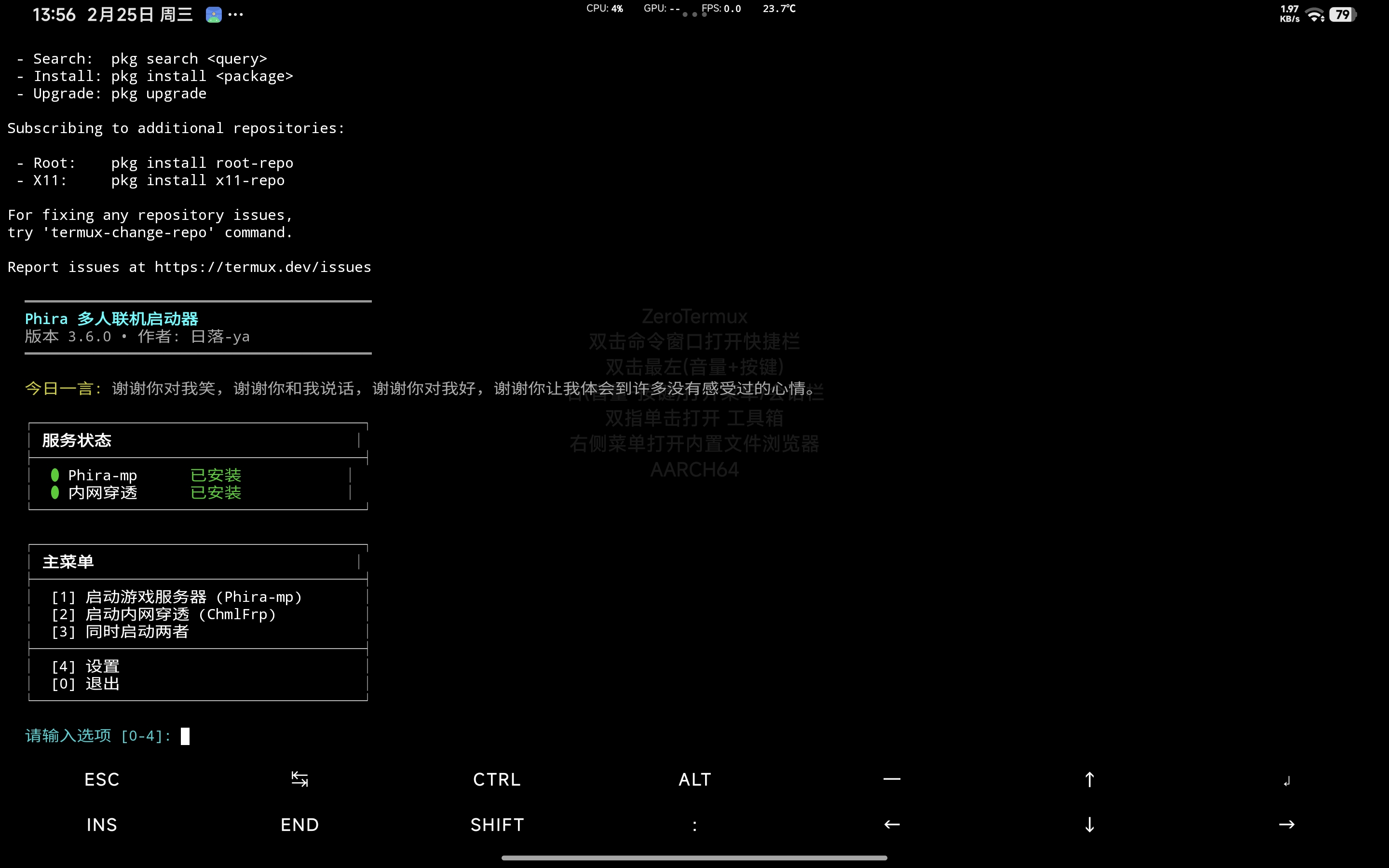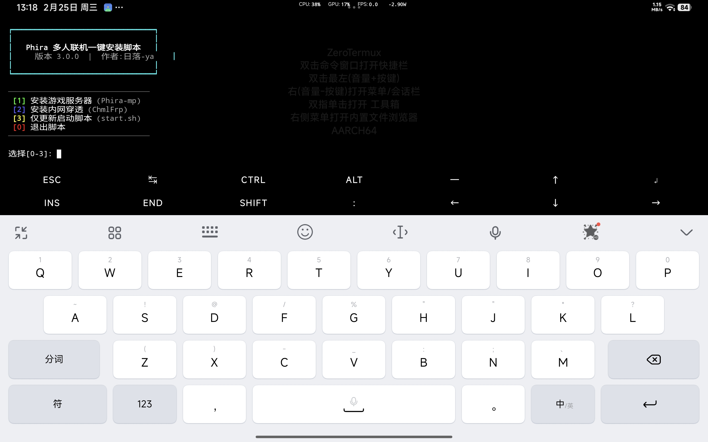 当出现以下界面说明Phira-mp安装完成,在该界面输入1回车继续安装内网穿透
