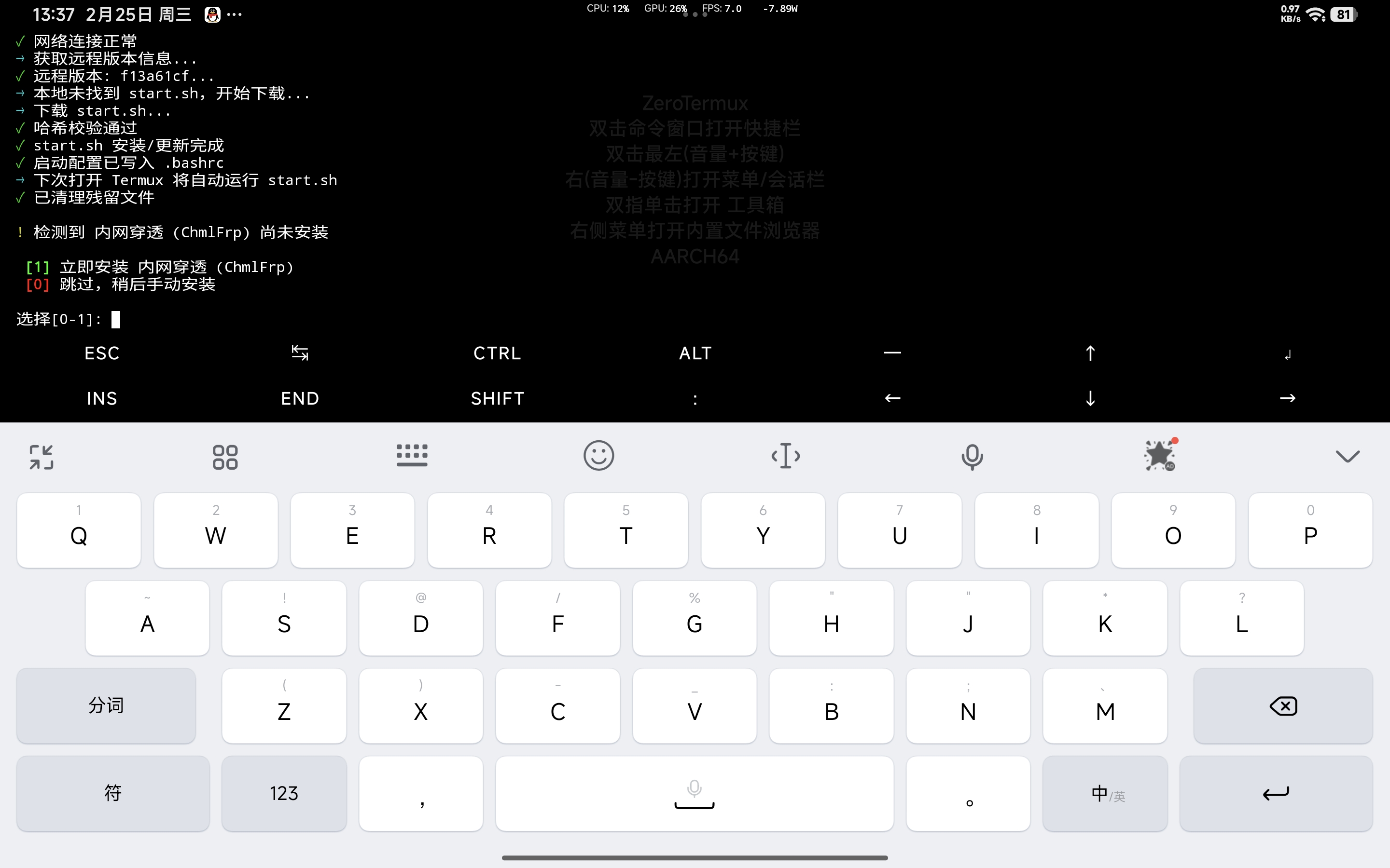 注意:安装完成后每次打开ZeroTermux都会卡一下才显示启动器是正常的,因为会检测更新