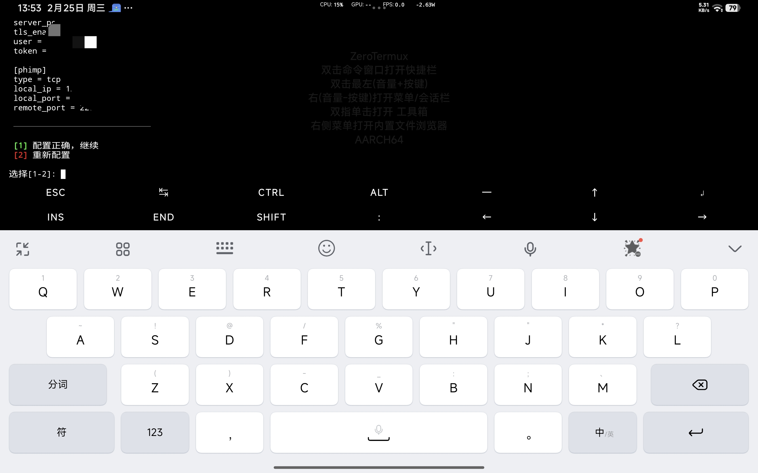 在设置页输入2即可修改内网穿透配置 在内网穿透配置页面输入2即可修改配置 修改配置与之前一样 粘贴你的配置代码并回车输入0再次回车即可