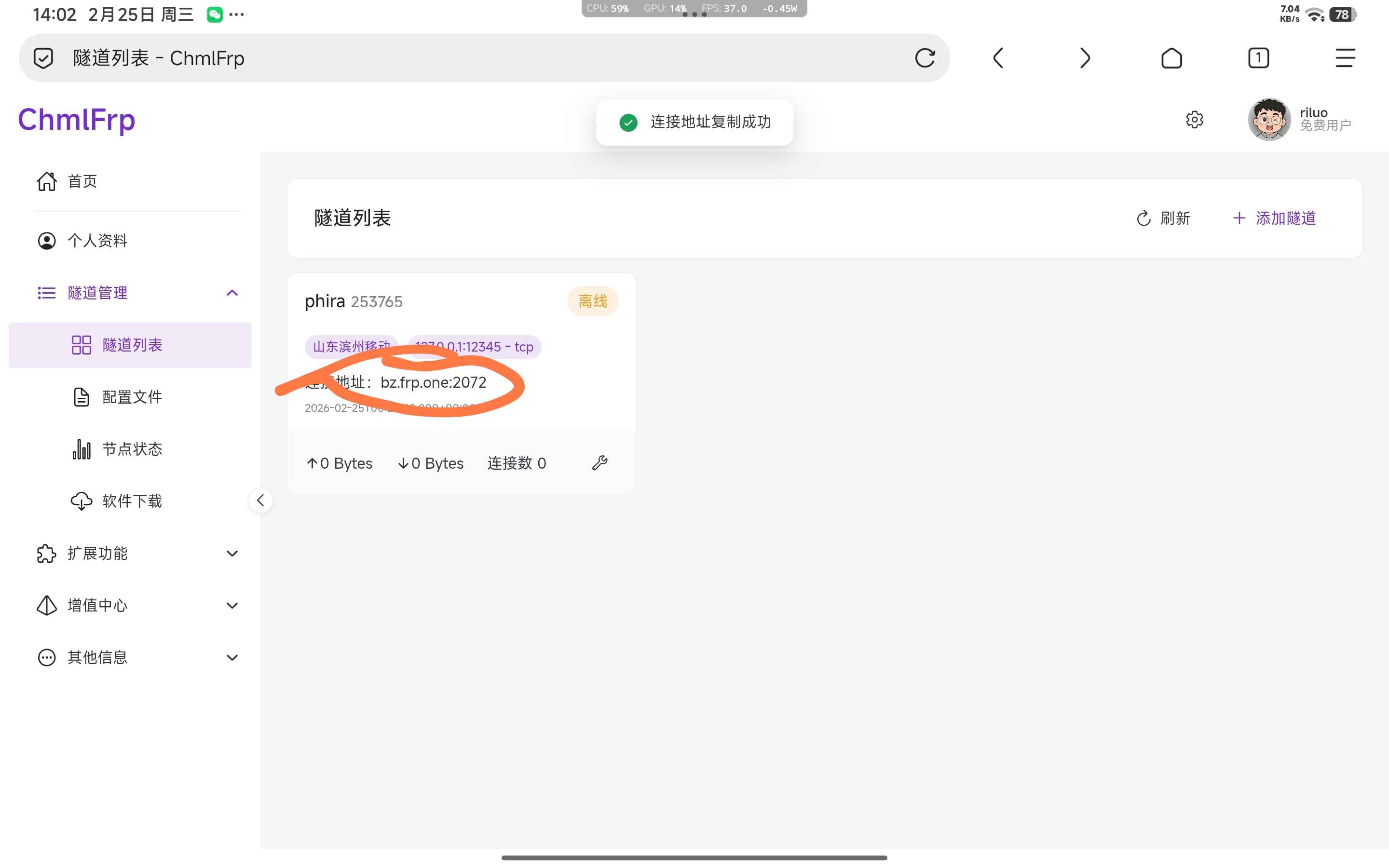 在隧道列表页面点击链接地址即可复制服务器地址,Phira联机服务器地址就填写这个即可