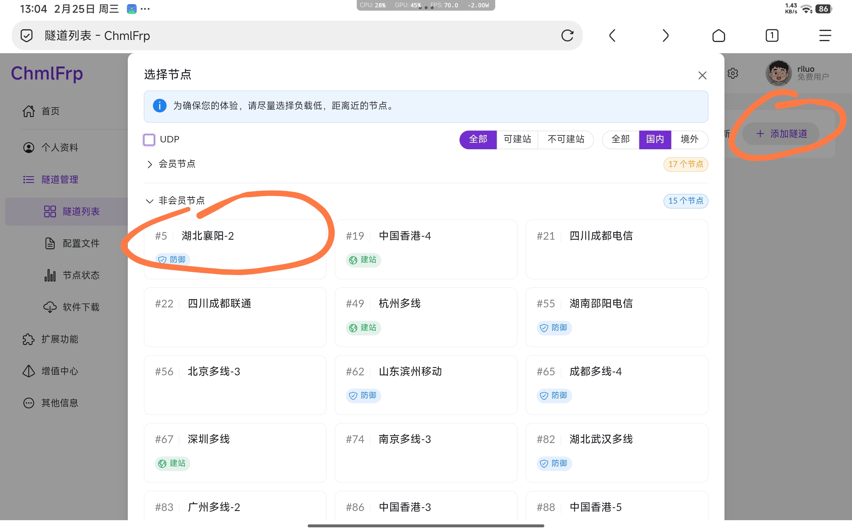 点击添加隧道选择一个距离自己近的节点 这里以** 湖北襄阳-2**为例