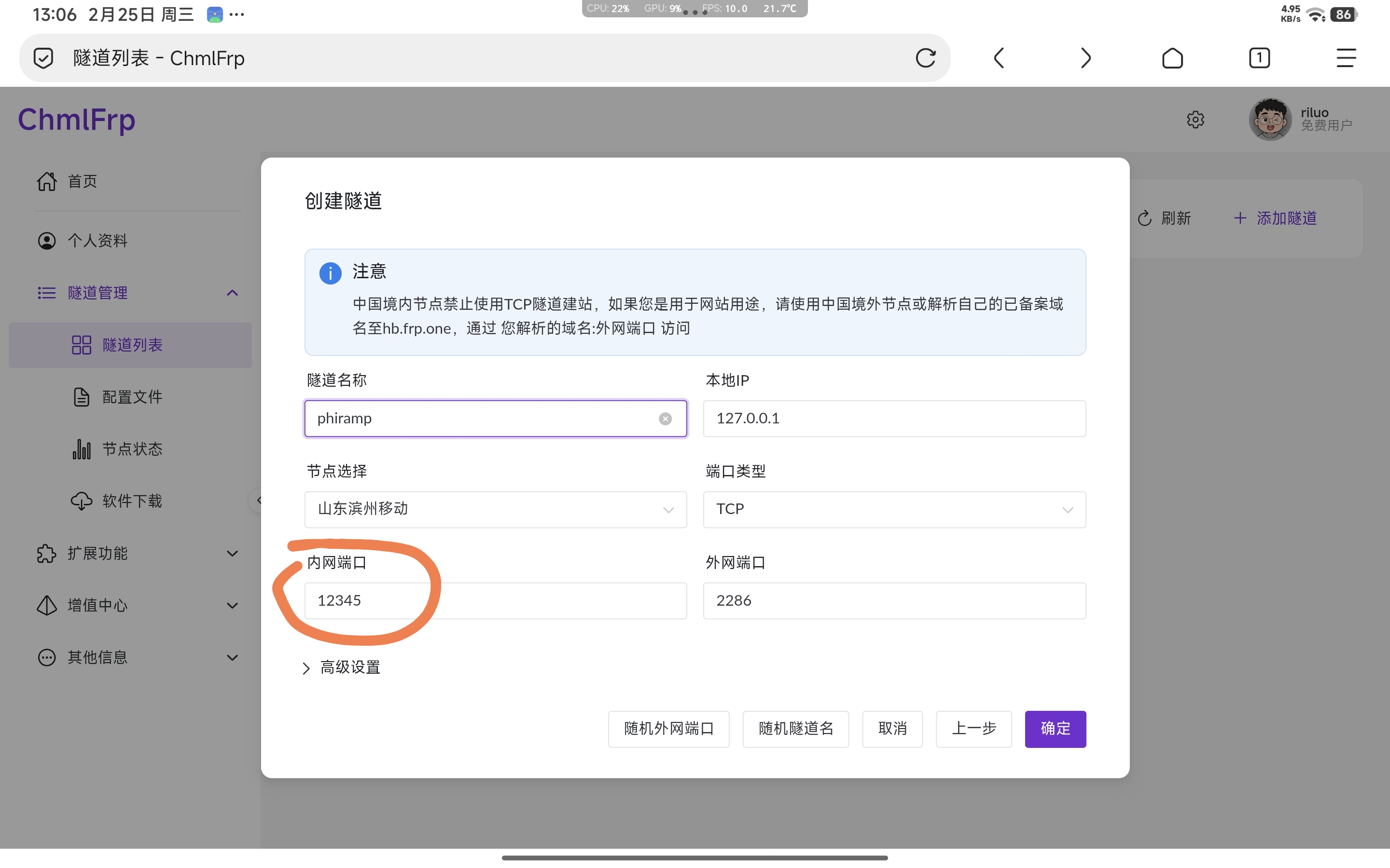 点击继续 隧道名称可以自定义,也可以默认 内网端口填写12345