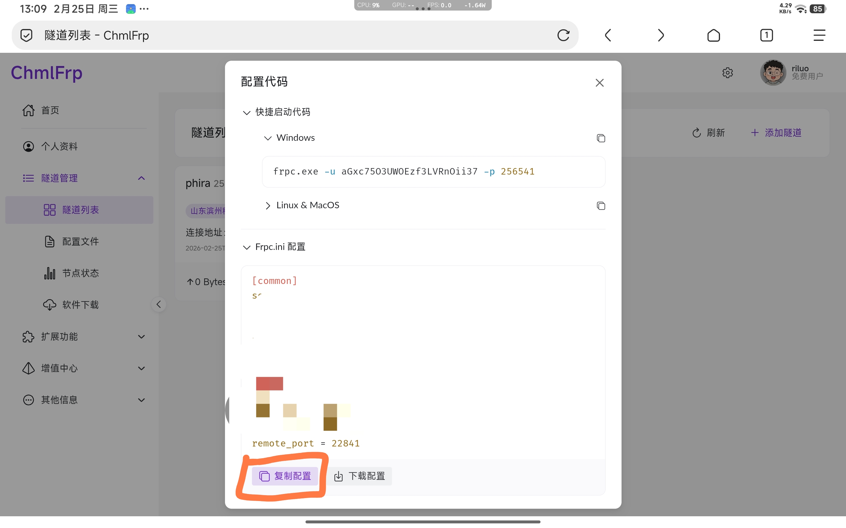 点击卡片下方的小板手,点击获取配置代码 点击Frpc.ini 配置点击下方的复制配置